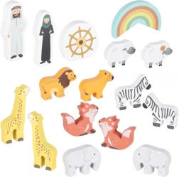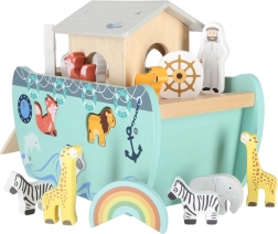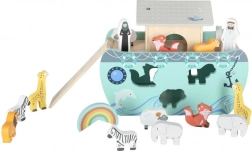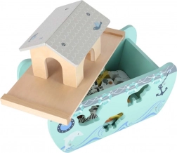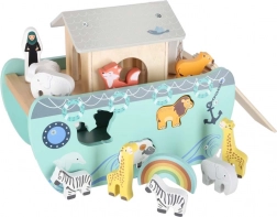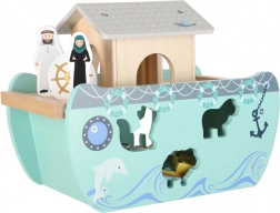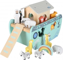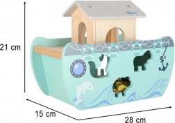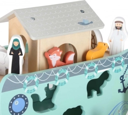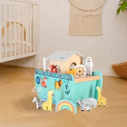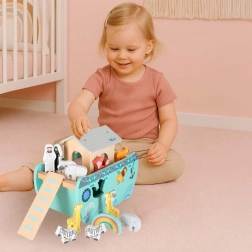 Objavte drevenú hračku, ktorá spája tvarový sorter, voľnú hru a rozprávanie príbehov. Archa s odnímateľnou rampou a strechou ukrýva sadu zvieracích figúrok a dve postavy Noema s manželkou – deti môžu loď nakladať, riadiť kormidlom a zvieratká vkladať do správnych otvorov.