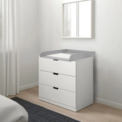 Praktický drevený prebaľovací nadstavec v elegantnej sivej farbe na bezpečné a pohodlné prebaľovanie. Ponúka jednoduchú montáž aj demontáž, posuvnú prednú dosku až o 4 cm a kompatibilitu s komodami IKEA (Nordli, Malm, Hemnes). Ideálne riešenie na úsporu miesta a premyslenú organizáciu v detskej izbe.