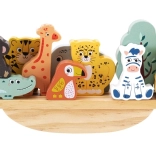 Vydajte sa na dobrodružnú výpravu do sveta safari s drevenou balančnou hrou, ktorá rozvíja jemnú motoriku, trpezlivosť a zmysel pre rovnováhu. Deti budú na hojdajúcu sa plošinu ukladať rozkošné zvieratká ako lev, zebra, žirafa či opička a trénovať koordináciu aj sústredenie. Hra je zábavná pre jednotlivcov aj vo dvojici a vďaka kvalitnému drevenému spracovaniu a veselým farbám ozdobí každú detskú izbičku.