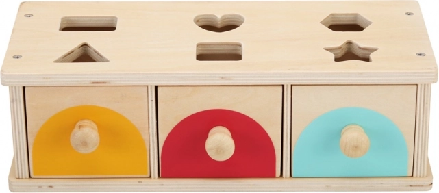 Chytrá drevená hračka pre najmenších, ktorá spája zábavu s učením. Deti vhadzujú farebné tvary do zodpovedajúcich otvorov a hotové dieliky sa zosunú do troch farebne odlíšených zásuviek. Okamžitá spätná väzba rozvíja pochopenie príčiny a následku, logické myslenie, koordináciu ruka–oko aj jemnú motoriku.