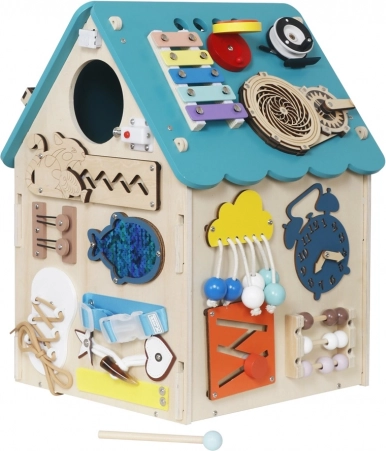 Objavte čaro učenia hrou s týmto interaktívnym montessori domčekom v tyrkysovej farbe od 2Kids Toys. Ponúka deťom bohaté aktivity na rozvoj jemnej motoriky, logického myslenia a koordinácie ruka–oko. Nájdete tu zámky a západky s tajnými dvierkami, spinner, otáčateľnú minutku, vypínače, farebný labyrint, xylofón s paličkou aj hodiny – všetko v bezpečnom drevenom prevedení.
