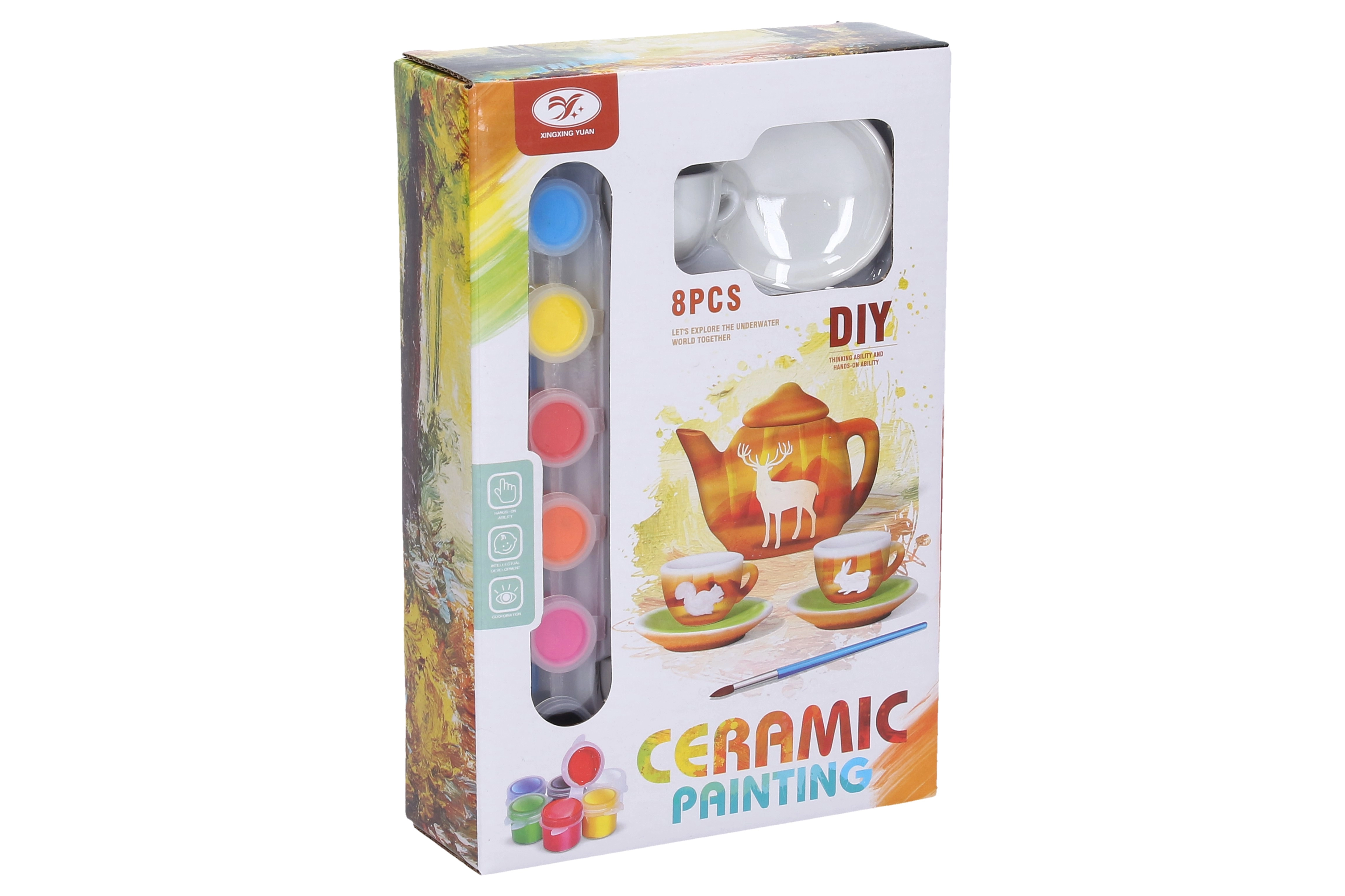- Kompletné balenie: kanvička s pokrievkou, 2 hrnčeky, 2 podšálky, 6 farieb, štetec
