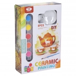 - Kanvička s pokrievkou, 2 hrnčeky, 2 podšálky, sada 6 farieb, štetec
