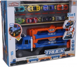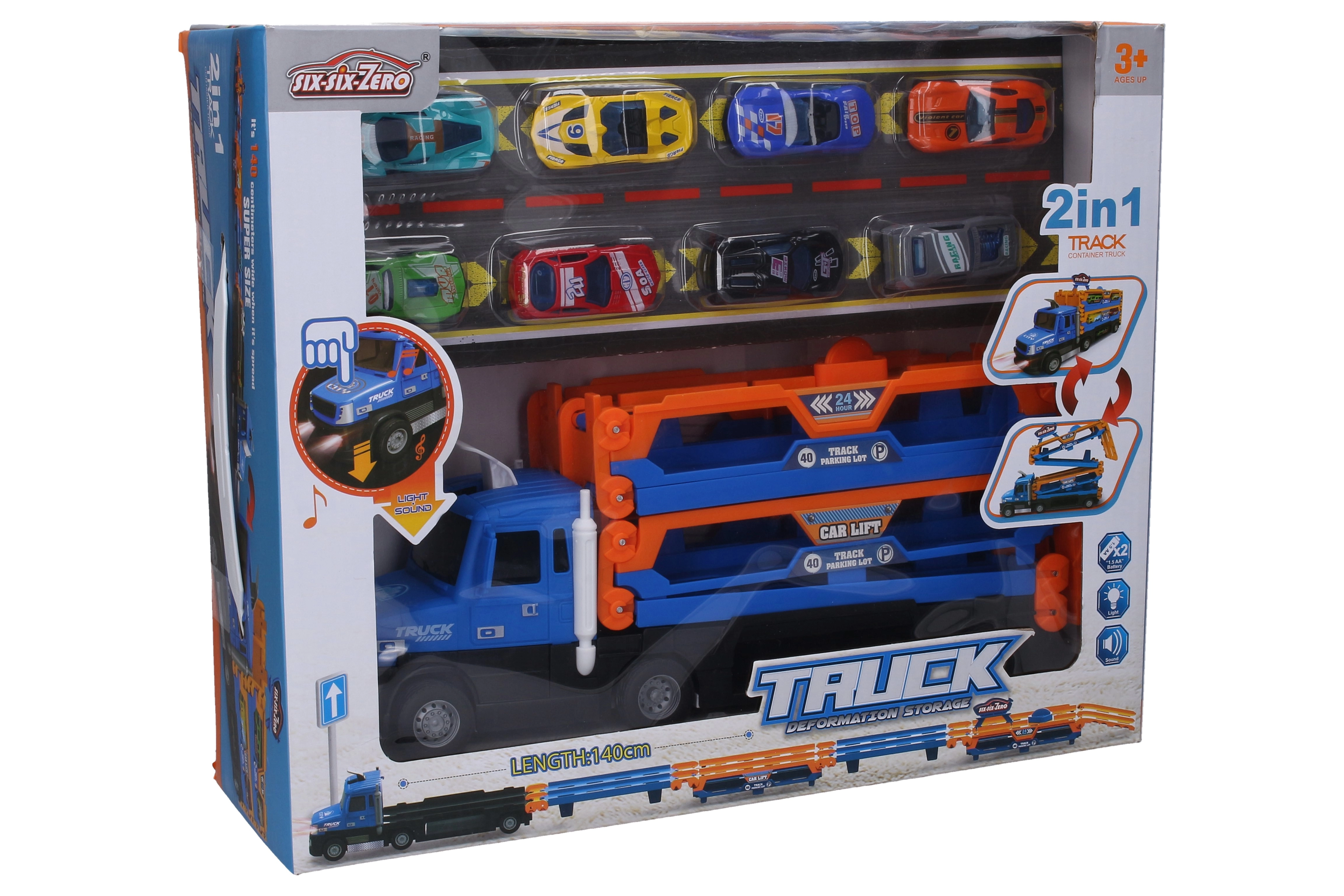 Súčasťou balenia je 8 kovových autíčok (cca 6,5 cm) s voľne bežiacimi kolesami, takže ste pripravení pretekať hneď po rozbalení. V zloženom stave má ťahač kompaktné rozmery, čo uľahčuje prenášanie aj skladovanie.