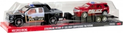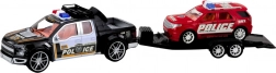 Čierny policajný pick-up ťahá na prívese červené SUV s výraznými nápismi POLICE. Detaily, majáky a voľnobežné kolesá podporujú predstavivú hru.