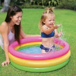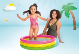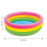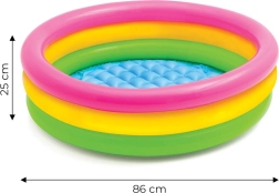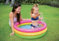 Nafukovací bazénik INTEX prináša deťom radosť z vodných hier priamo na vašej záhrade. Vďaka kompaktným rozmerom 86 × 25 cm sa zmestí takmer kamkoľvek a nízka hladina vody 17 cm zvyšuje pocit bezpečia pre najmenších. Dúhové farebné prevedenie je pútavé a láka k hre.