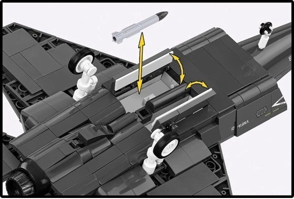 Stavebnica obsahuje 614 precízne vyrobených dielikov s odolnými potlačami, takže vzhľad zostane dlhodobo výrazný. Užijete si otvárateľnú kabínu, polohovateľné riadiace plochy, gumové kolesá a bombovnicu. Nechýba ani stojanček na efektné vystavenie a figúrka pilota v americkej leteckej výstroji.
