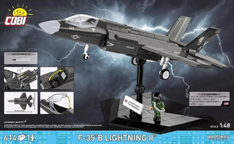 Postavte si legendárny viacúčelový stíhací lietadlo piatej generácie F‑35B LIGHTNING II v mierke 1:48. Táto stavebnica z 614 detailných dielikov ponúka otváraciu kabínu, pohyblivé ovládacie plochy, gumové pneumatiky, otvárateľný bombový priestor aj autentické potlače bez nálepiek. Súčasťou je figúrka pilota, elegantný stojanček so štítkom a oficiálna licencia LOCKHEED MARTIN.