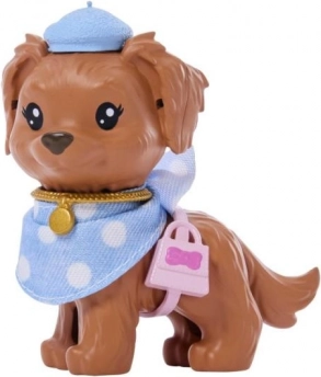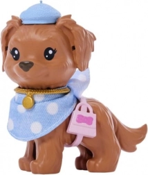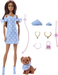 Bodkované šaty, baret a doplnky bábiky sú zladené s roztomilým psíkom pre dokonalý módny pár.