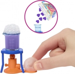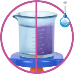 Set obsahuje špeciálnu kadičku s termochromickým efektom na hru so zmenou farby a ďalšie laboratórne nástroje, ktoré podporujú jemnú motoriku, kreativitu a zvedavosť. Bábika má batikované šaty, tenisky a biely laboratórny plášť – pripravená na každé vedecké dobrodružstvo.