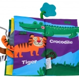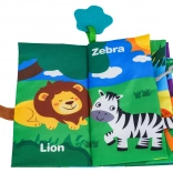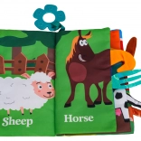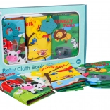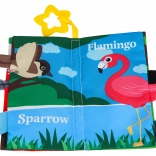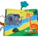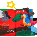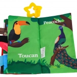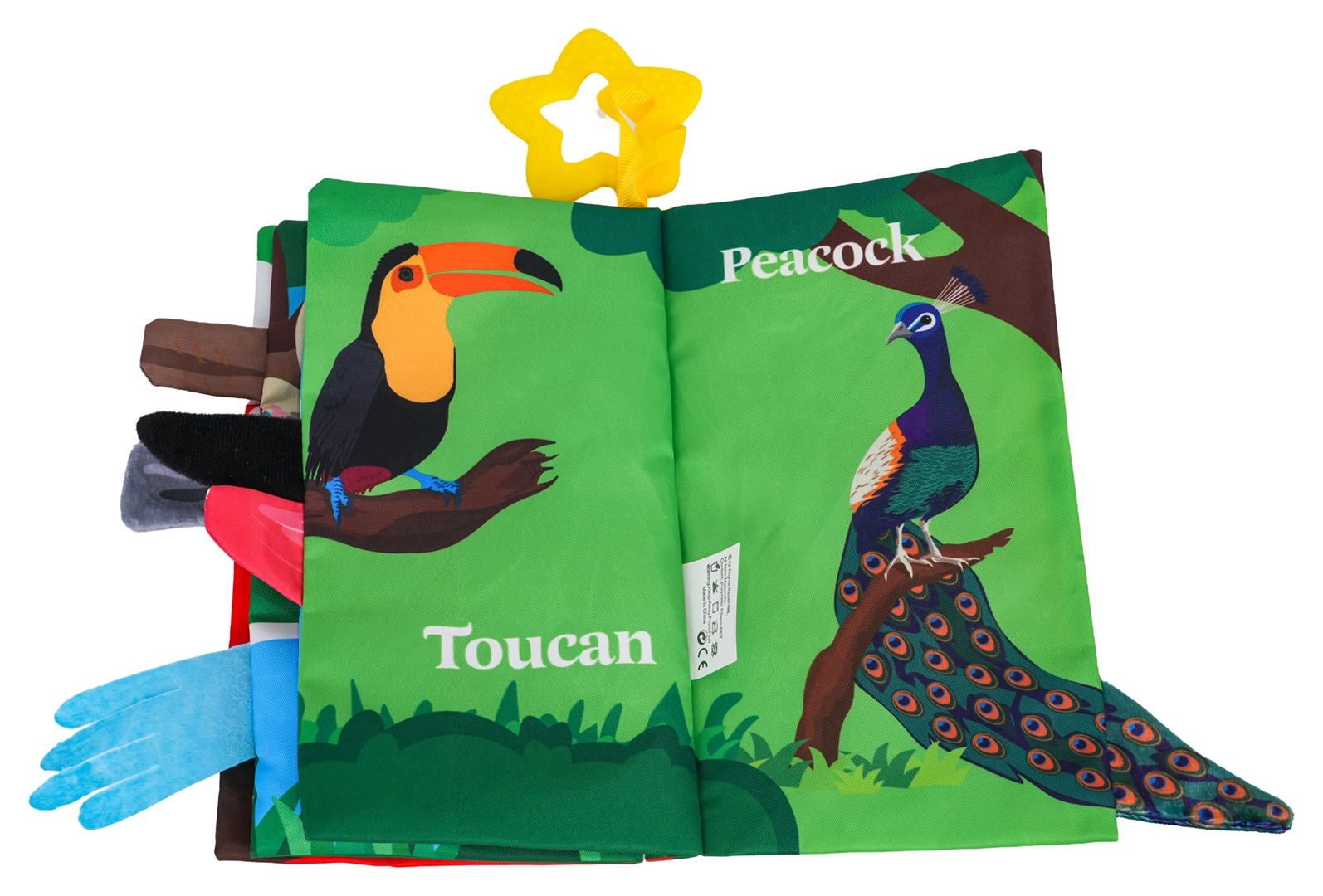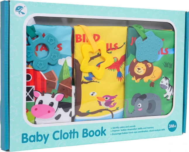 Objavte rozkošnú sadu troch látkových knižiek pre deti od 3 mesiacov, ktoré rozvíjajú zmysly aj jemnú motoriku. Každá knižka ponúka šušťavé strany, mäkké textúry, vystupujúce zvieracie chvosty a praktické hryzadlo/klip na pripnutie. Témy farma, vtáky a džungľa zaujmú pestrými ilustráciami a jednoduchými popiskami zvierat v angličtine. Látkové knižky sú ľahké, vodeodolné a ľahko sa čistia – ideálne doma aj na cesty.