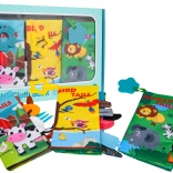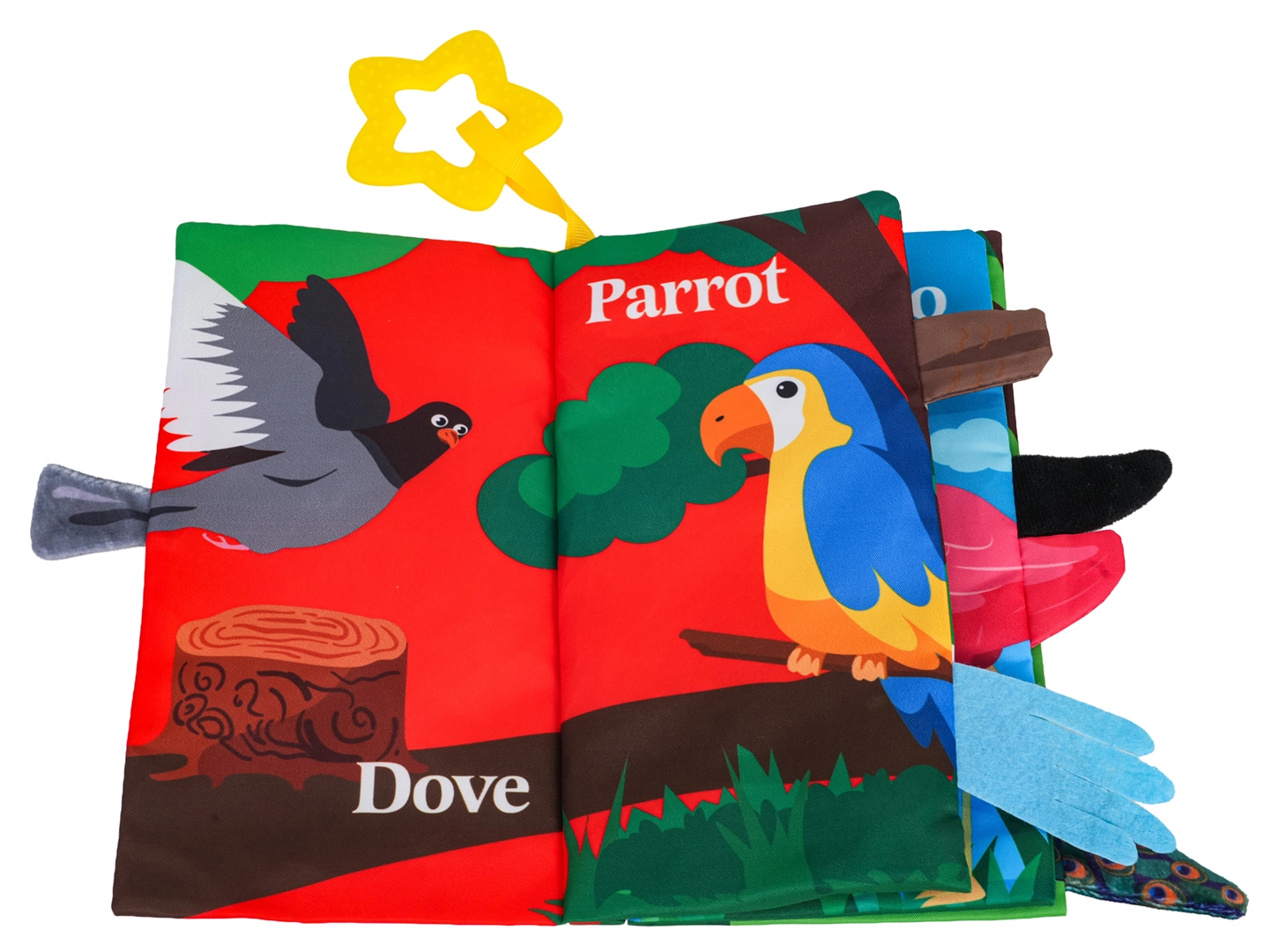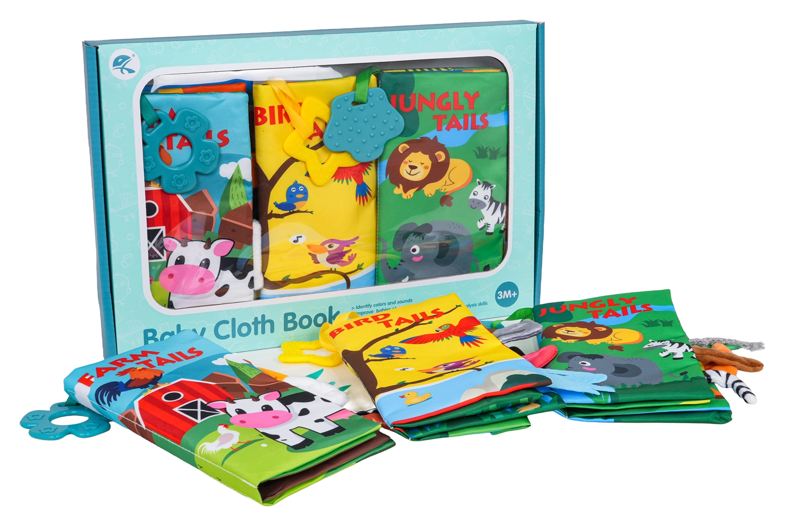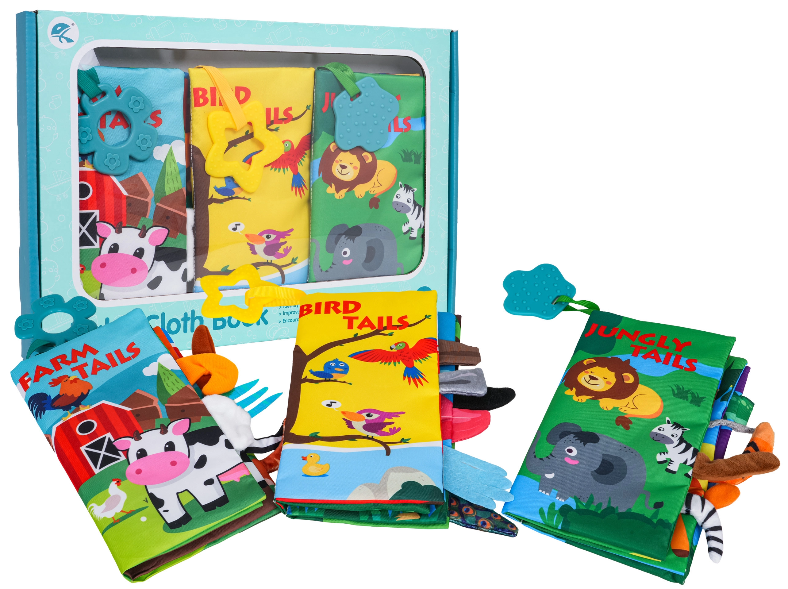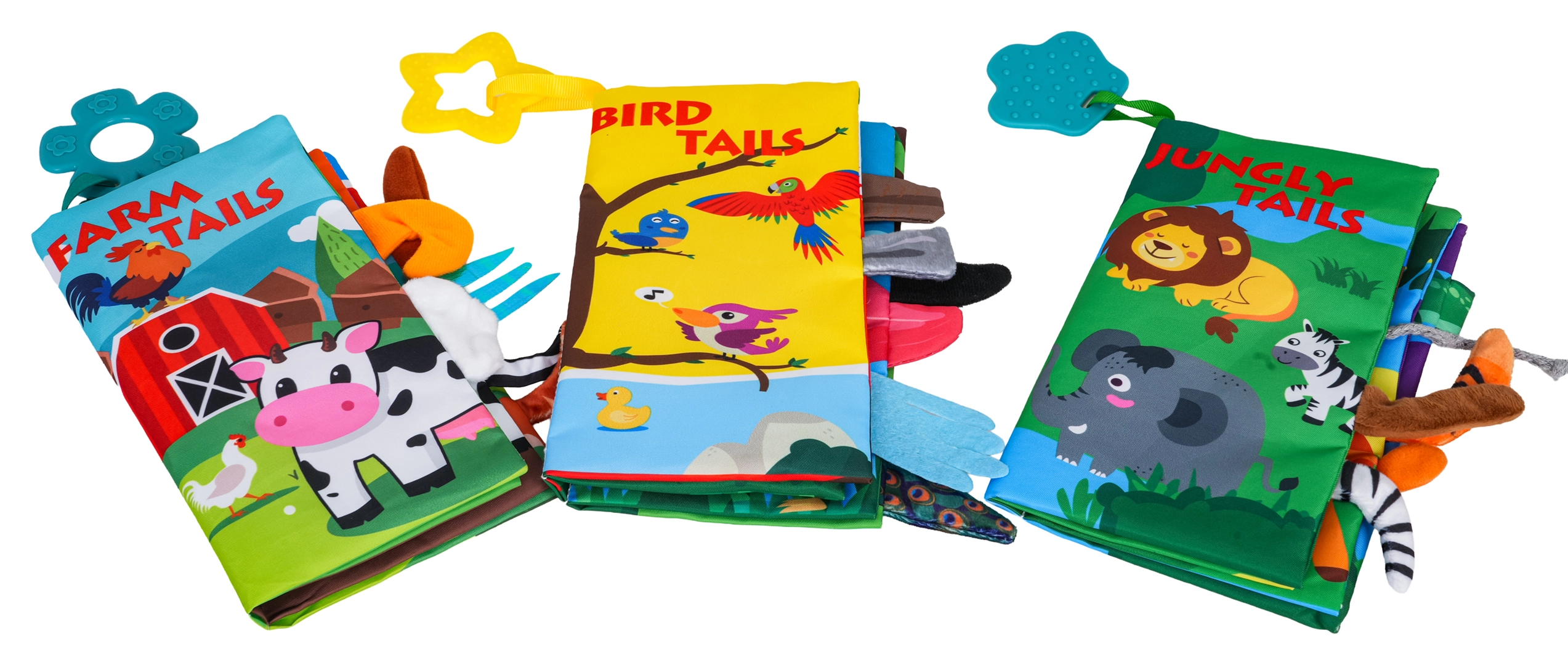 Tri mäkké látkové knižky Farm Tails, Bird Tails a Jungly Tails prinášajú deťom bezpečnú a podnetnú zábavu už od 3 mesiacov. Farebné ilustrácie, šušťavé efekty a hmatové prvky v podobe chvostov, krídiel a uší podporujú zmyslový rozvoj, koordináciu ruka–oko a prvé učenie názvov zvierat v angličtine.