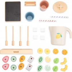 Obsah balenia poteší detailným spracovaním: dva kelímky so slamkami, džbán s viečkom, tabuľka s ceduľkou na dennú ponuku, štyri špízy so stojanom a množstvo drevených ovocných plátkov. Materiál je kvalitný a príjemný na dotyk, s dôrazom na bezpečnosť a šetrnosť k prírode.