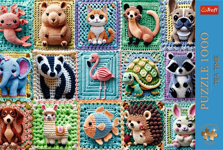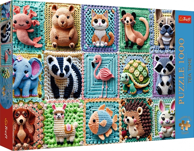 TREFL Premium Plus puzzle 1000 dielikov s motívom háčkovaných zvieratiek. Kvalitný kartón, unikátne tvary, FSC certifikácia a predloha. Rozmer 68,3 × 48 cm.