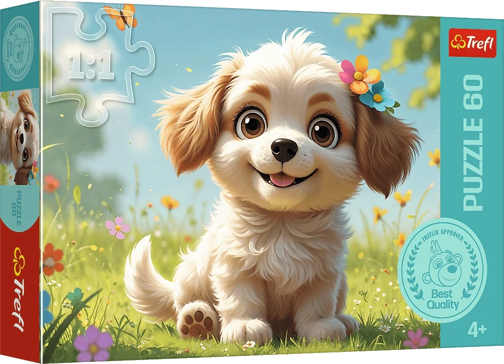 Užite si zábavu s kvalitným puzzle TREFL s motívom roztomilého šteniatka. Vďaka 60 pevným dielikom je skvelé pre deti, ktoré sa učia skladať väčšie obrázky, ale stále potrebujú prehľadný formát. Hotový obrázok má kompaktný rozmer cca 33 × 22 cm a ľahko sa zmestí na stôl či podložku.