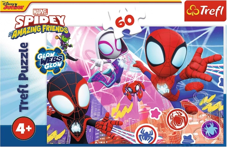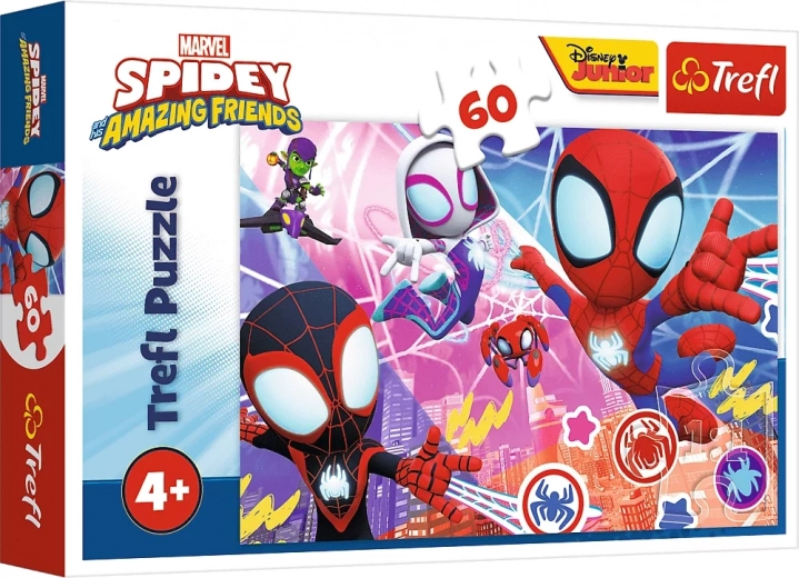 Detské puzzle Spidey so 60 dielikmi a rozmerom po zložení cca 33 × 22 cm. Zábavné skladanie pre deti, rozvoj motoriky a sústredenia.