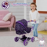Štýlový kočík pre bábiky s motívom Šťastný zajačik poteší každú malú mamičku. Ponúka ľahký skladací rám na jednoduché uloženie, mäkkú penovú rukoväť s výškou cca 56 cm a výsuvnú striešku na ochranu bábiky. Vhodný pre bábiky do cca 46 cm a doplnený o praktický nákupný košík.