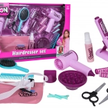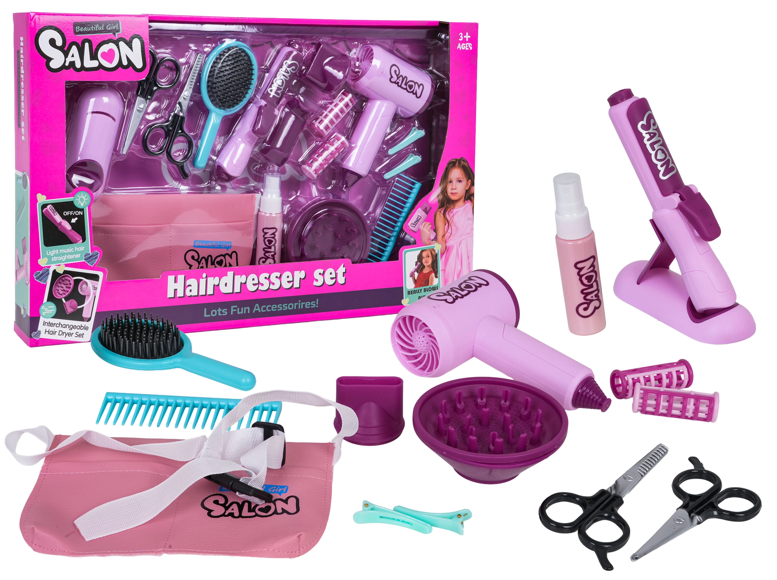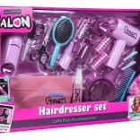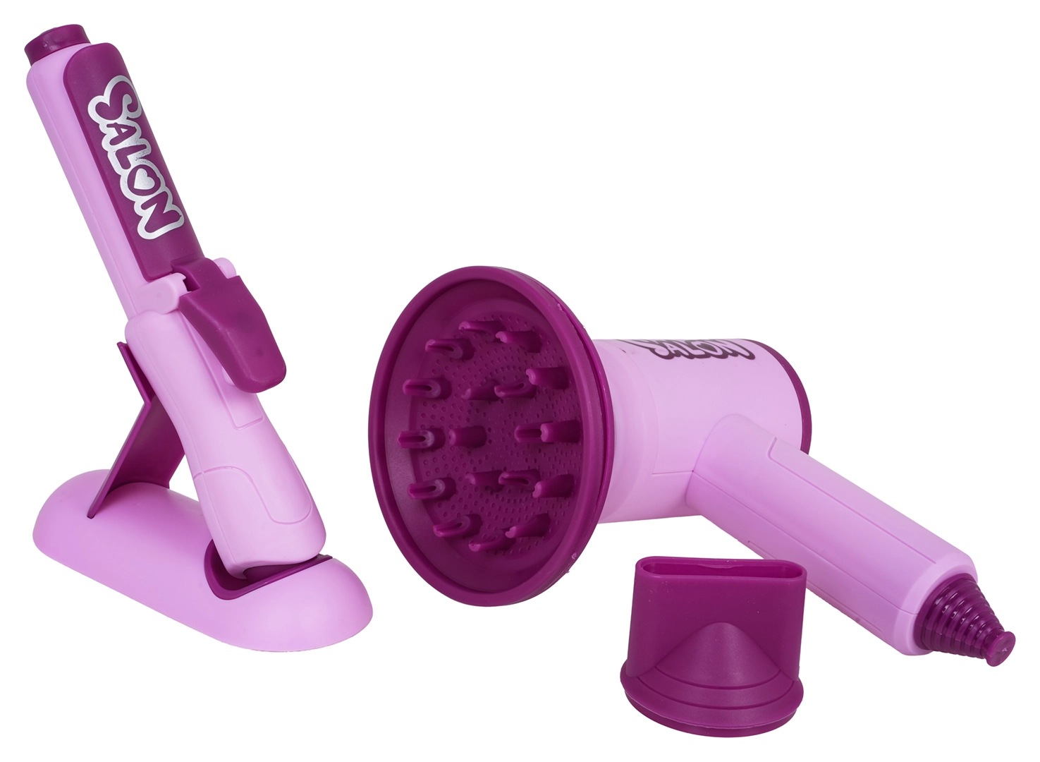 Súčasťou je detský fén s dvoma nadstavcami (difuzér a koncentrátor), ktorý vydáva zvuk sušenia a poskytuje jemný prúd vzduchu pre autentický zážitok. Detská žehlička je napájaná gombíkovými batériami a má svetelný efekt. Set dopĺňajú hrebeň, kefa, nožnice, efilačné nožnice, sponky, natáčky aj fľaštička na „kozmetiku“ – perfektné pre kreatívnu hru a rozvoj jemnej motoriky.