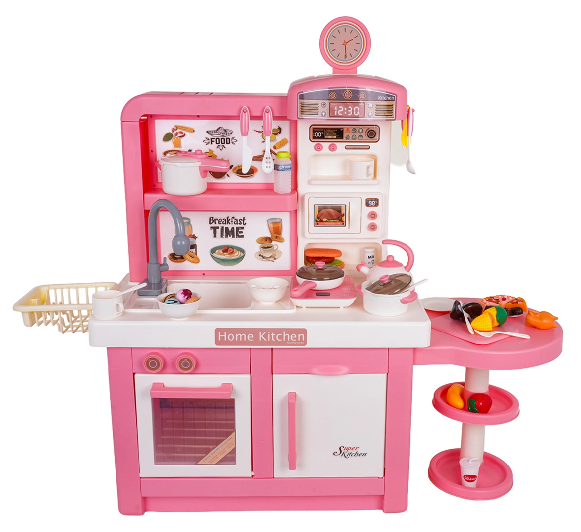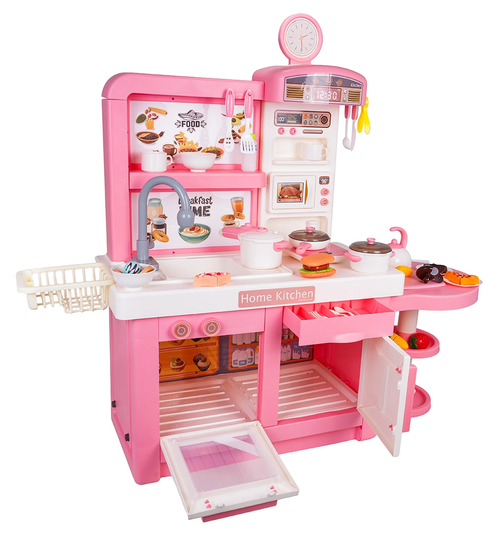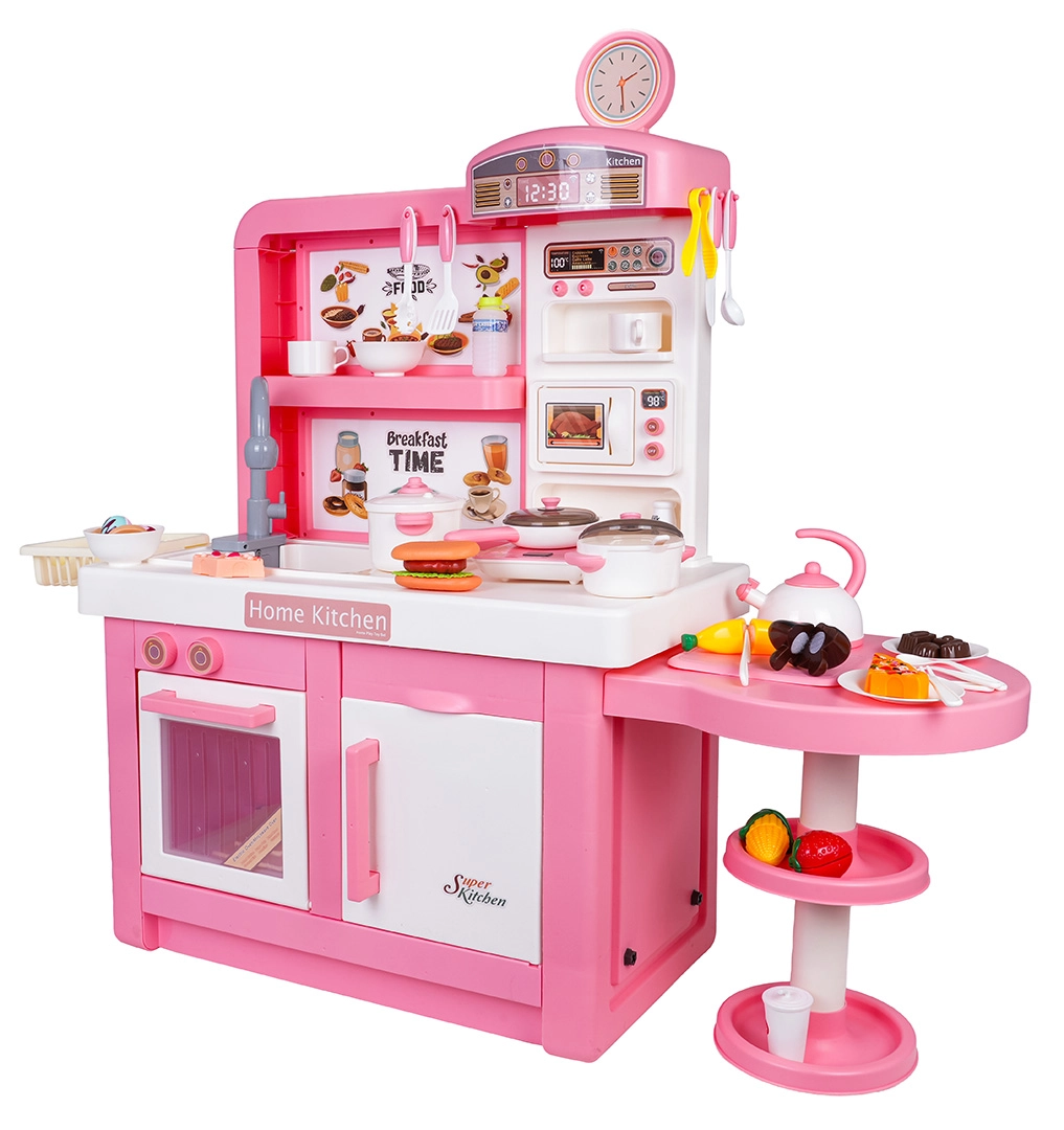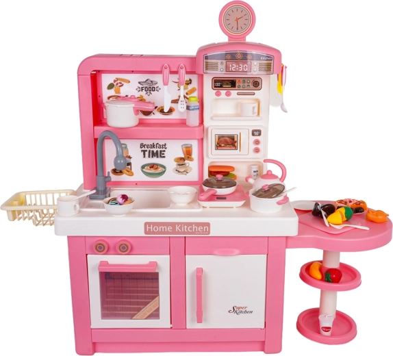 Táto interaktívna kuchynka v ružovo‑bielej kombinácii je navrhnutá pre bezpečnú a kreatívnu hru. Deti si užijú realistické prvky ako mikrovlnka, drez s kohútikom, indukčná varná doska, rúra, kávovar a „chladnička“. Otočné gombíky vydávajú zvuky varenia a smaženia, podsvietený horák s displejom teploty umocní atmosféru a z jedného hrnca sa uvoľňuje jemná studená para.