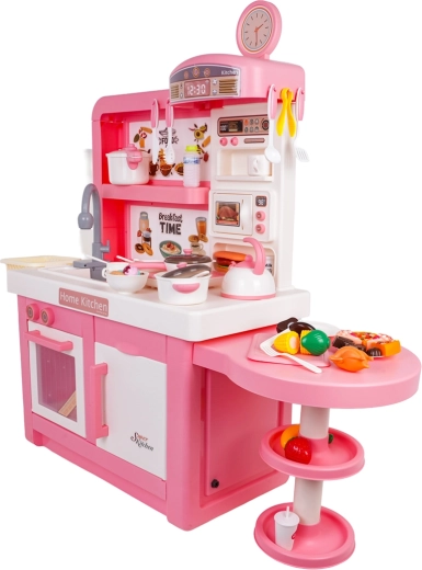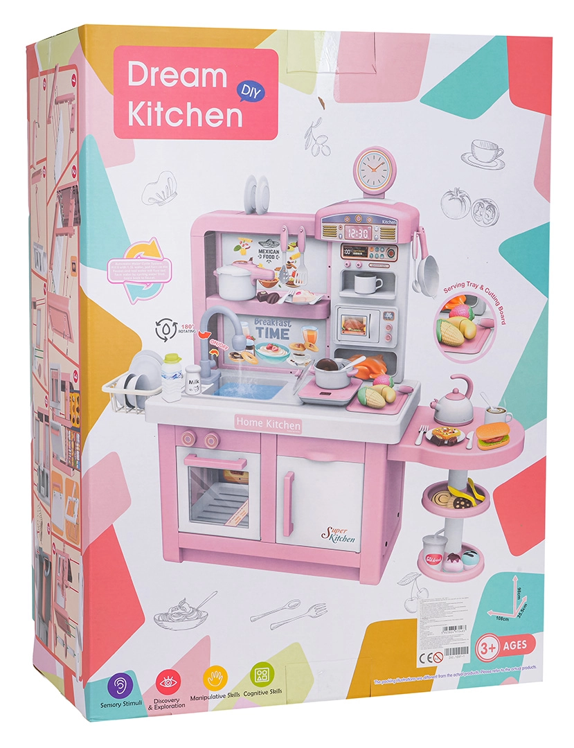 Štýlová ružovo‑biela detská kuchynka plná funkcií nadchne malých kuchárov od 3 rokov. Ponúka svetelné a zvukové efekty, skutočne tečúcu vodu z kohútika, podsvietenú indukčnú dosku s displejom teploty a bezpečnú studenú paru z hrnca. Súčasťou je bohaté príslušenstvo – hrnce, panvička, riad, príbory, potraviny aj stojan na dezerty pre realistickú hru na varenie, pečenie a servírovanie.