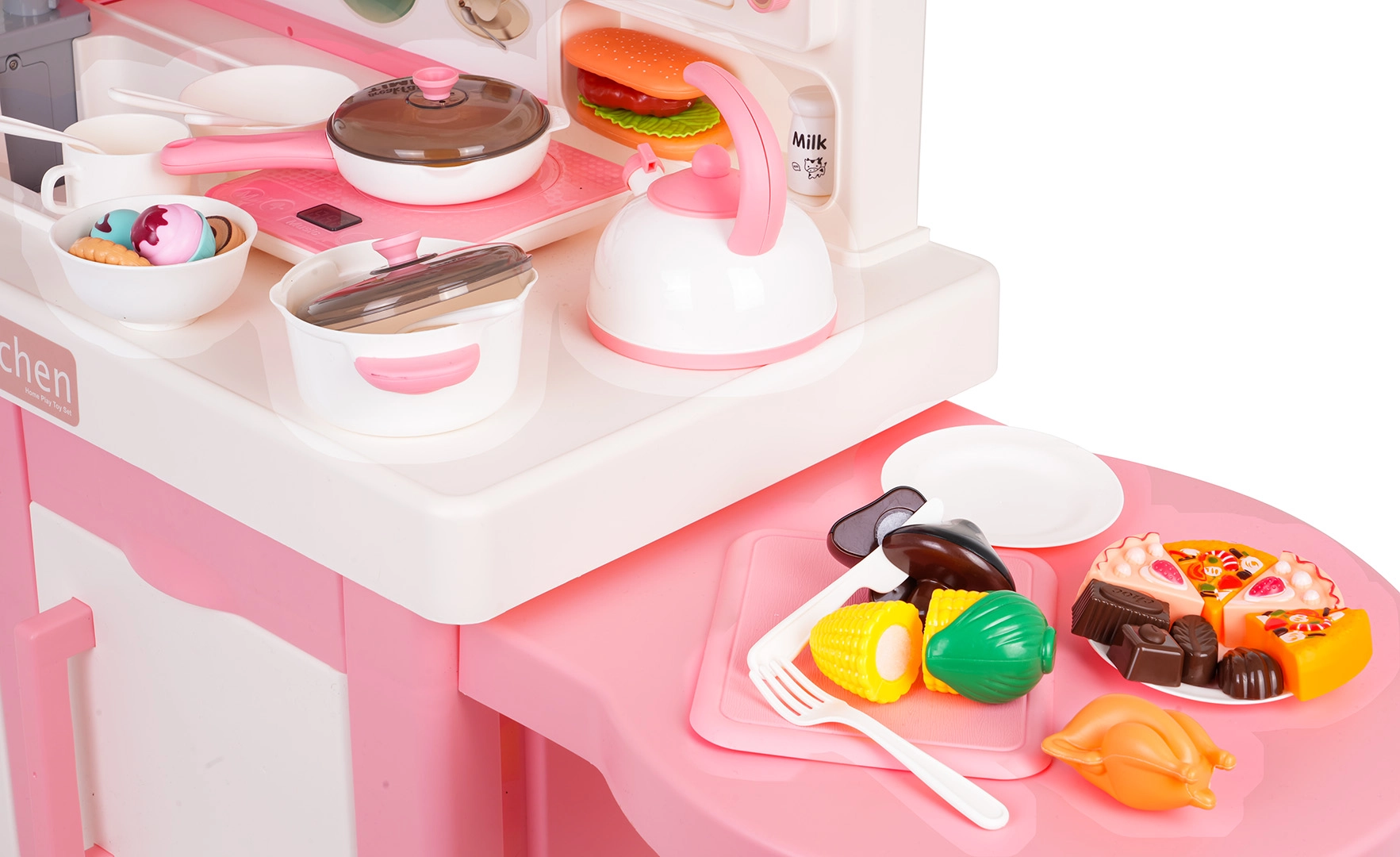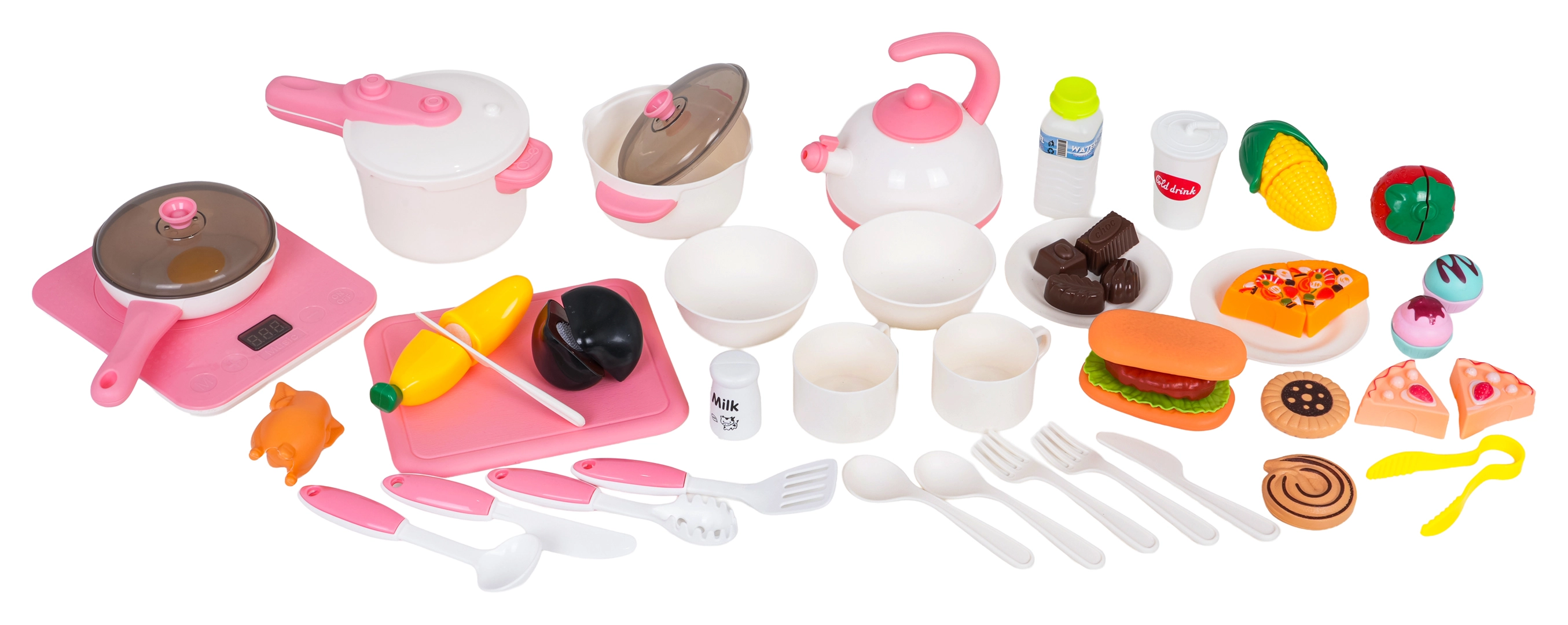 Kuchynka so stojanom na dezerty, drezom, odkvapkávačom, indukčnou doskou a hodinami; kanvica; tlakový hrniec; hrniec s pokrievkou; panvica s pokrievkou; 2× tanier; 2× miska; 2× kelímok; veľký nôž, lyžica na cestoviny, naberačka, obracačka; 2× nôž, 2× vidlička, 2× lyžica; potraviny a suroviny na suchý zips (huba, jahoda, kukurica, banán, kurča, rezeň, volské oko, šalát, 4× sušienka, 4× čokoládka, 2× kúsok pizze, 2× kúsok torty, mlieko, voda, káva)