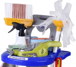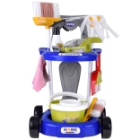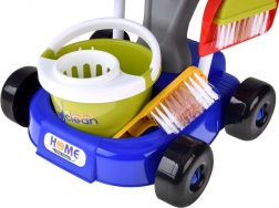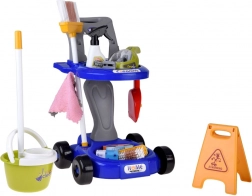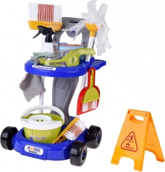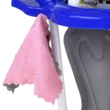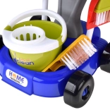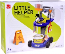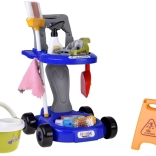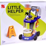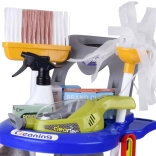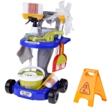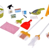 Mop, metla, smetáčik a lopatka, vedro s lisom, handrička, rozprašovač, varovná tabuľka a krabičky – všetko, čo deti potrebujú na napodobňovanie domácich prác.