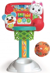 Zábavný interaktívny basketbalový kôš pre najmenších od 18 mesiacov. Tabuľa počíta koše, učí čísla a prvé slová v poľštine a podporuje jemnú aj hrubú motoriku, koordináciu pohybov a aktívnu hru. Vďaka nastaviteľnému stojanu a odnímateľnej tabuli rastie s dieťaťom. Súčasťou je mäkký textilný kôš a veselý dizajn s mačiatkom a medvedíkom.