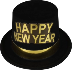 Dodajte svojmu Silvestru iskru. Tento elegantný čierny klobúk so žiarivým zlatým pásikom a nápisom HAPPY NEW YEAR upúta pozornosť a podčiarkne atmosféru polnočného odpočítavania. Je ideálny na domáce párty, kluby aj firemné večierky.