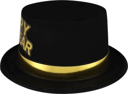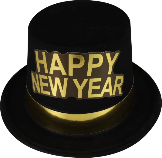 Štýlový čierny klobúk so zlatým lemom a výrazným nápisom HAPPY NEW YEAR je perfektný doplnok na silvestrovskú párty aj novoročné oslavy. Ľahký a pohodlný na nosenie, dodá vášmu outfitu luxusný slávnostný vzhľad a skvele sa hodí tiež ako fotorekvizita.