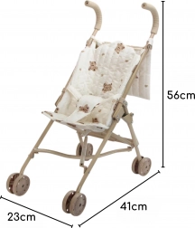 Tento štýlový kočík pre bábiky kombinuje pohodlie, bezpečie a praktickú skladnosť. Dvojité kolieska umožňujú plynulý pohyb, zatiaľ čo pevná, no ľahká konštrukcia sa behom chvíľky zloží do kompaktnej veľkosti. Krémové sedadlo s roztomilým vzorom medvedíkov dodáva hre čaro a láka k ďalším dobrodružstvám doma i vonku.
