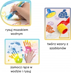 Súčasťou sady je bohaté príslušenstvo, ktoré rozširuje možnosti hry – od vodných fixiek a pečiatok až po valček so vzormi a šablóny písmen a tvarov. Všetko je ľahké, skladné a vhodné domov aj na cesty.