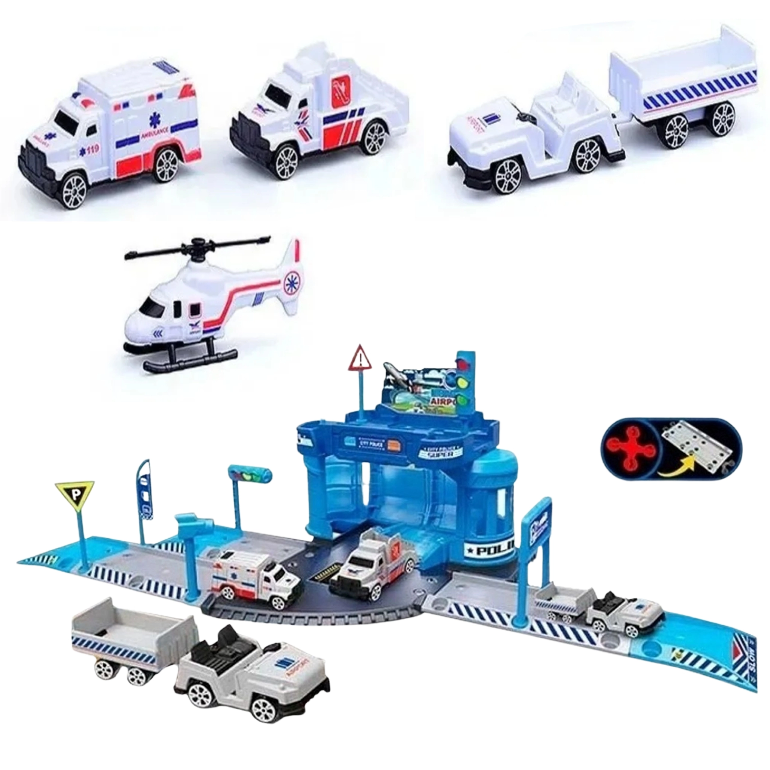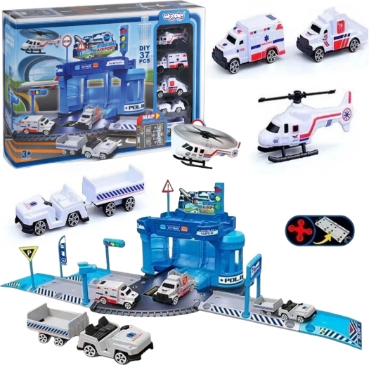 Sada obsahuje skladateľnú budovu stanice, policajné auto, malý policajný vrtuľník, letiskové schodové vozidlo, vozidlo s prívesom na batožinu, dopravné značky, prvky príjazdovej cesty a fóliovú podložku 78 × 58 cm. Deti si rozvíjajú jemnú motoriku, koordináciu oko–ruka aj fantáziu.