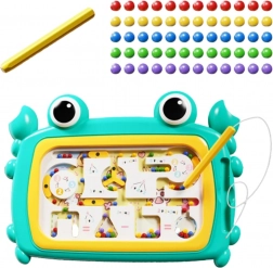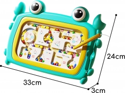 Tyrkysová magnetická tabuľa v tvare kraba spája zábavu a vzdelávanie: triedenie farieb, vedenie guličiek po dráhach a skladanie jednoduchých príkladov pomocou priložených kariet. Magnetické pero na šnúrke sa dobre drží a podporuje správny úchop.