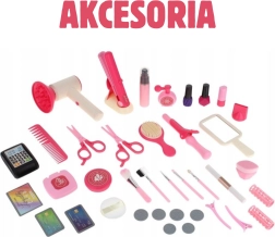 - Kufrík s uškom, 2 sponky, 4 natáčky, hubka na púder, rozprašovač/mist, 7 štetcov na líčenie, 2 laky na nechty, „riasenka“, „parfém“, očné tiene, „púder“, kulma, žehlička na vlasy, podstavec pod žehličku, hrebeň, kefa, zrkadielko, fén s vymeniteľnými nadstavcami (difuzér a plochá koncovka), platobný terminál, sada hračkárskych peňazí, karta stáleho zákazníka, platobná karta, kartónové balenia kozmetiky (šampón, kondicionér, gél), kartónový nápis „Beauty Salon“, 2 páry nožníc, „rúž“