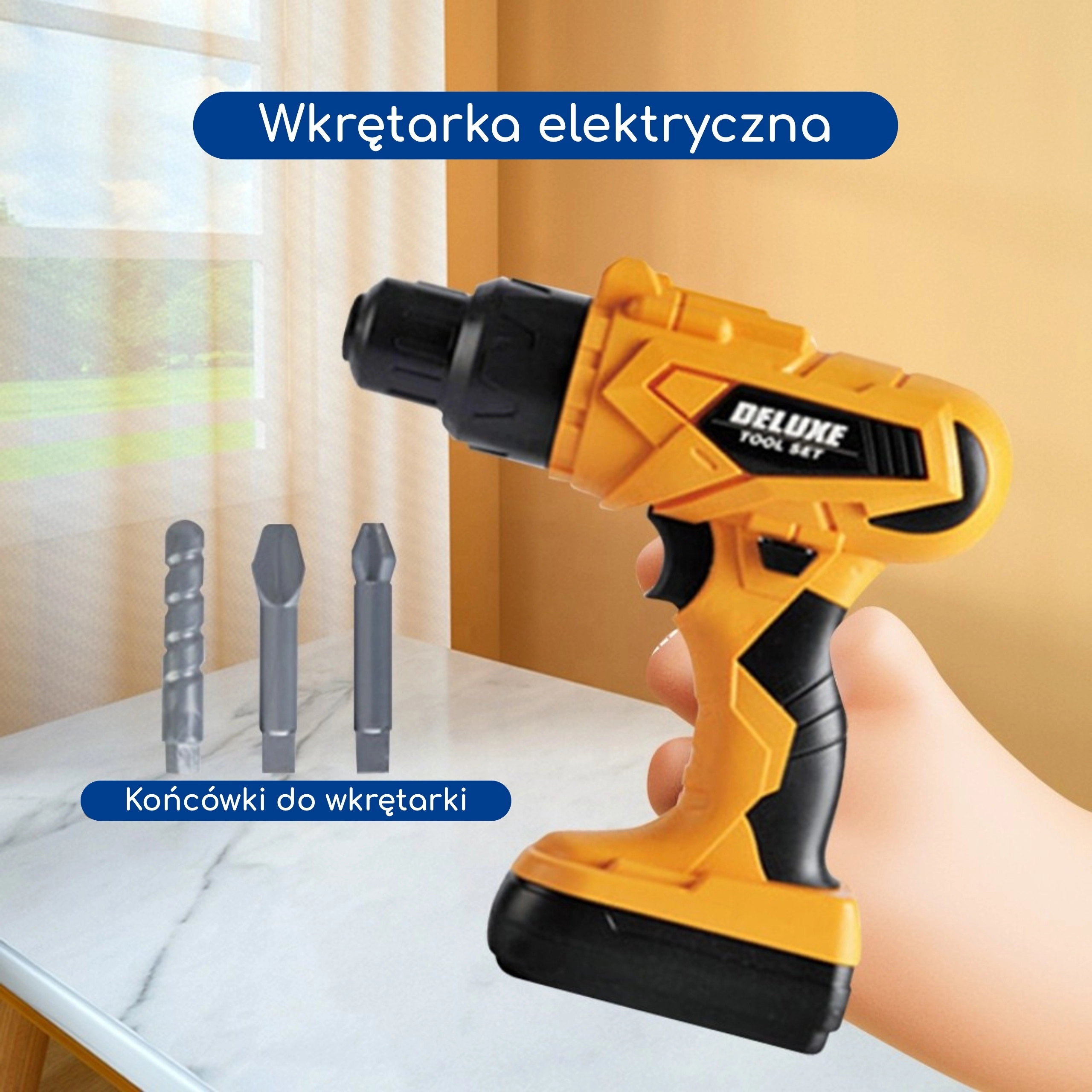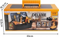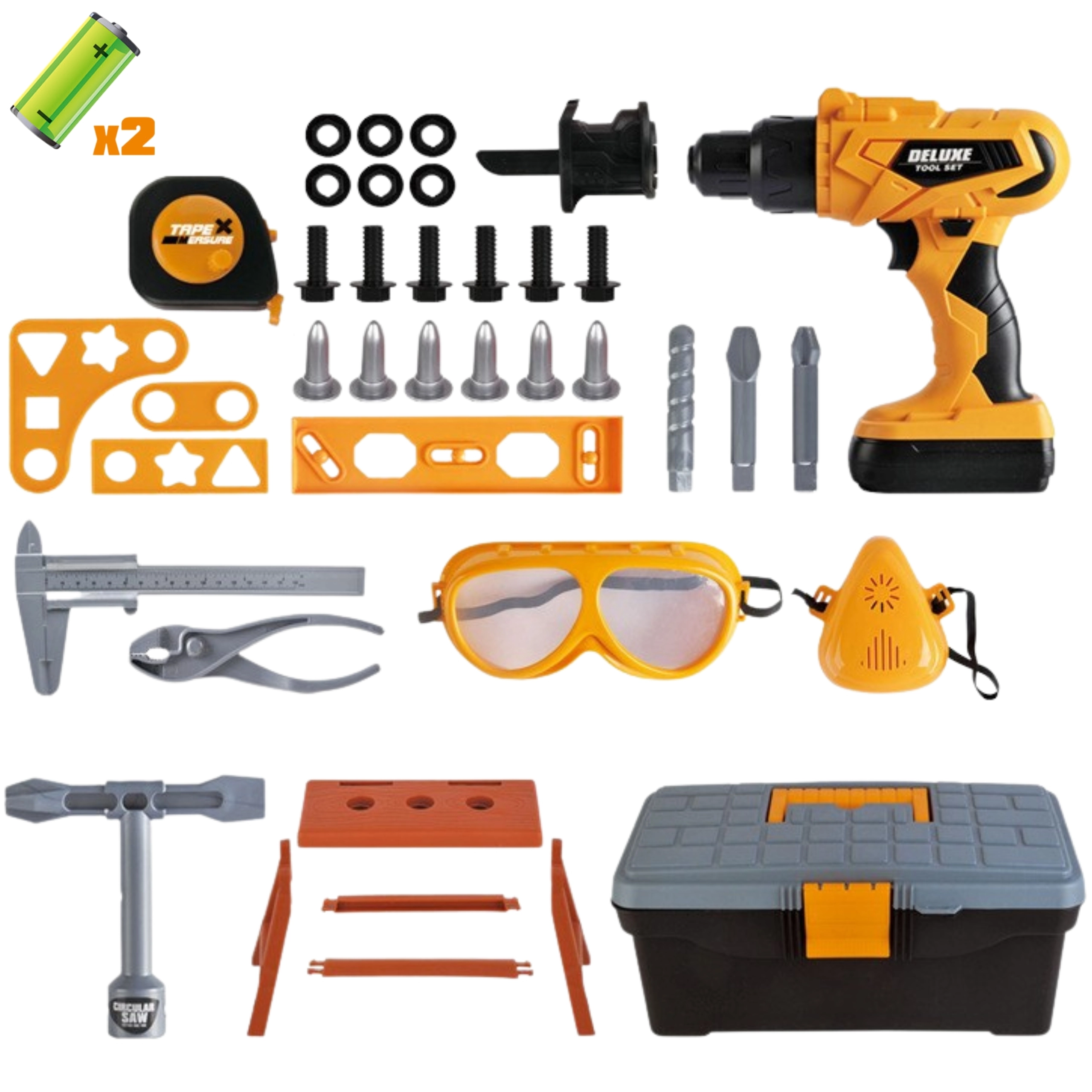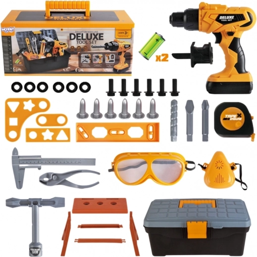 Všetko je uložené v pevnom kufríku/skrinke na náradie, ktorý uľahčuje prenášanie aj organizáciu. Súčasťou sú tiež ochranné okuliare, skrutky, matice, bity, vrták, spojovacie doštičky, mini pracovný stolík a ďalšie nástroje (kľúč, meter, kliešte). Hračka je navrhnutá pre deti od 3 rokov a rozvíja manuálne zručnosti, kreativitu, predstavivosť a zrakovo-pohybovú koordináciu.