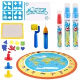 Objavte magickú vodnú podložku WOOPIE – okrúhlu mapu sveta, na ktorej deti kreslia len s vodnými fixkami. Farby sa objavia po kontakte s vodou a po vyschnutí zmiznú, takže zábava je bez neporiadku a znovu použiteľná. Súčasťou je bohatá sada šablón, pečiatok, valčeka a doplnkov na kreatívne tvorenie aj učenie o zvieratách a kontinentoch.