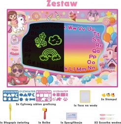 Balenie obsahuje: podložku 2v1 (cca 100 × 70 cm), UV pero, 2× vodná fixka, 2× šablóna, valček, 3× pečiatka a absorpčná handrička.