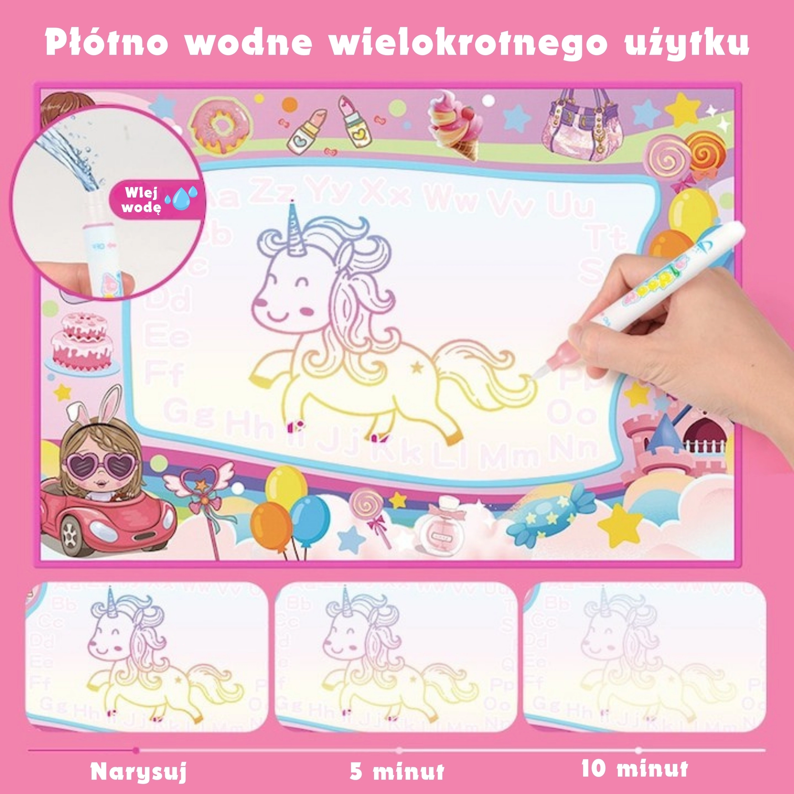 Objavte kúzlo tvorenia bez neporiadku s vodnou kresliacou podložkou 2v1 od značky WOOPIE. Deti môžu kresliť buď vodnými fixkami, alebo UV svetlom, pričom obrázky po pár minútach samy miznú a je možné tvoriť znova bez konca. Veľký formát ponúka veľa priestoru na kreatívnu hru, motív plný jednorožcov, balónikov a hviezd povzbudí fantáziu a podporuje jemnú motoriku aj koordináciu ruka–oko.