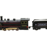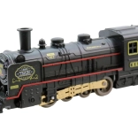 Čierna lokomotíva s červenými a zlatými prvkami, komínom a výraznými kolesami dodá každej jazde atmosféru skutočnej železnice.