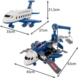 Rozkladací policajný lietadlo prináša deťom akčný svet záchranných zložiek v jednej hračke. Po otvorení sa zmení na prepracované parkovisko s prejazdnými rampami, garážami a zábavnými funkciami. Vďaka svetelným a zvukovým efektom a pohonu zadných kolies si deti užijú realistickú hru plnú naháňačiek a záchranných misií.