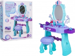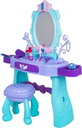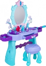 Štýlový detský toaletný stolík s veľkým zrkadlom, podsvietením a bohatou sadou doplnkov pre kreatívnu hru. Obsahuje stoličku, zásuvku a bočné police na príslušenstvo. V balení nájdete fén, kulmu so žehličkou, hrebene, okuliare, šperky a make-up doplnky. Na svetlo zrkadla stačia 2× AA batérie (nie sú súčasťou). Ideálny darček pre malé princezné od 3 rokov.