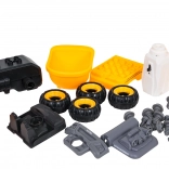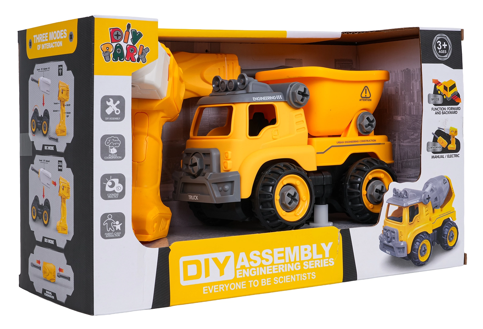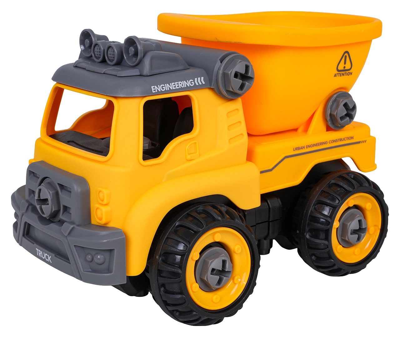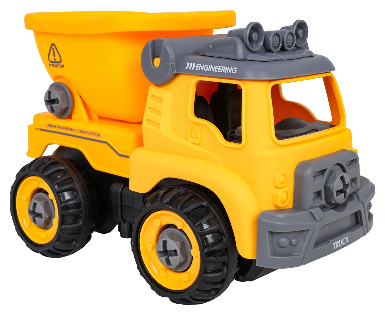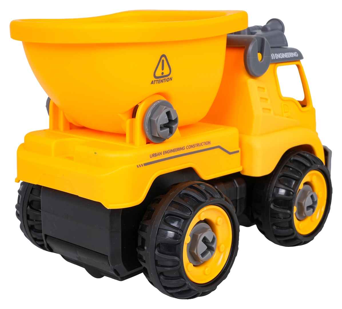 Stavebný sklápač je dodávaný kompletne zložený a pripravený na jazdu. Pomocou priloženej batériovej vŕtačky a ručného skrutkovača ho môžu deti rozobrať na jednotlivé diely a opäť zostaviť. Vozidlo je vyrobené z odolného plastu v živých farbách, takže zvládne každodenné hranie.