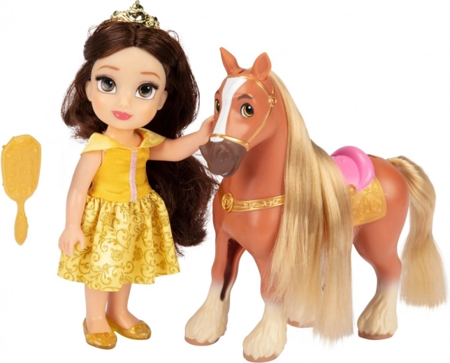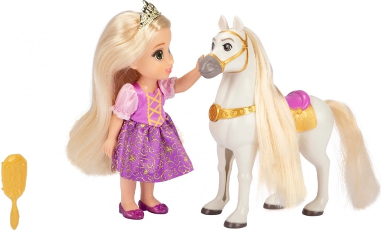 Táto magická sada prenesie deti do sveta DISNEY rozprávok. Bábika RAPUNZEL vo fialových šatách alebo BELLE v žltých šatách je pripravená na vychádzku so svojím koníkom. Vďaka priloženej kefe je možné česať a upravovať dlhé vlasy bábiky aj hrivu koňa.