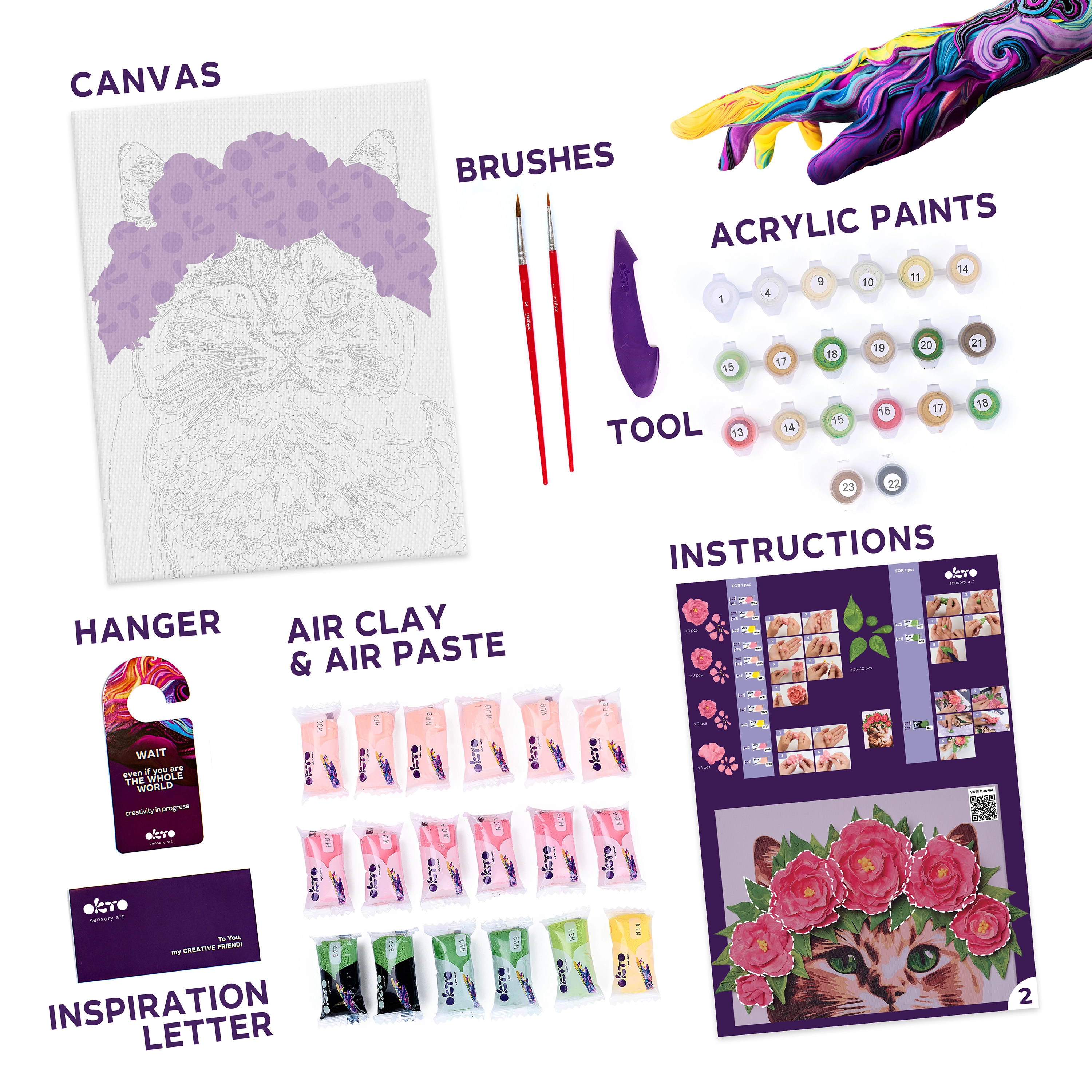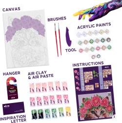 - Kompletné balenie: plátno, obrázkový návod, modelovací nástroj, samoschnúca modelovacia hmota, sada farieb, štetec.