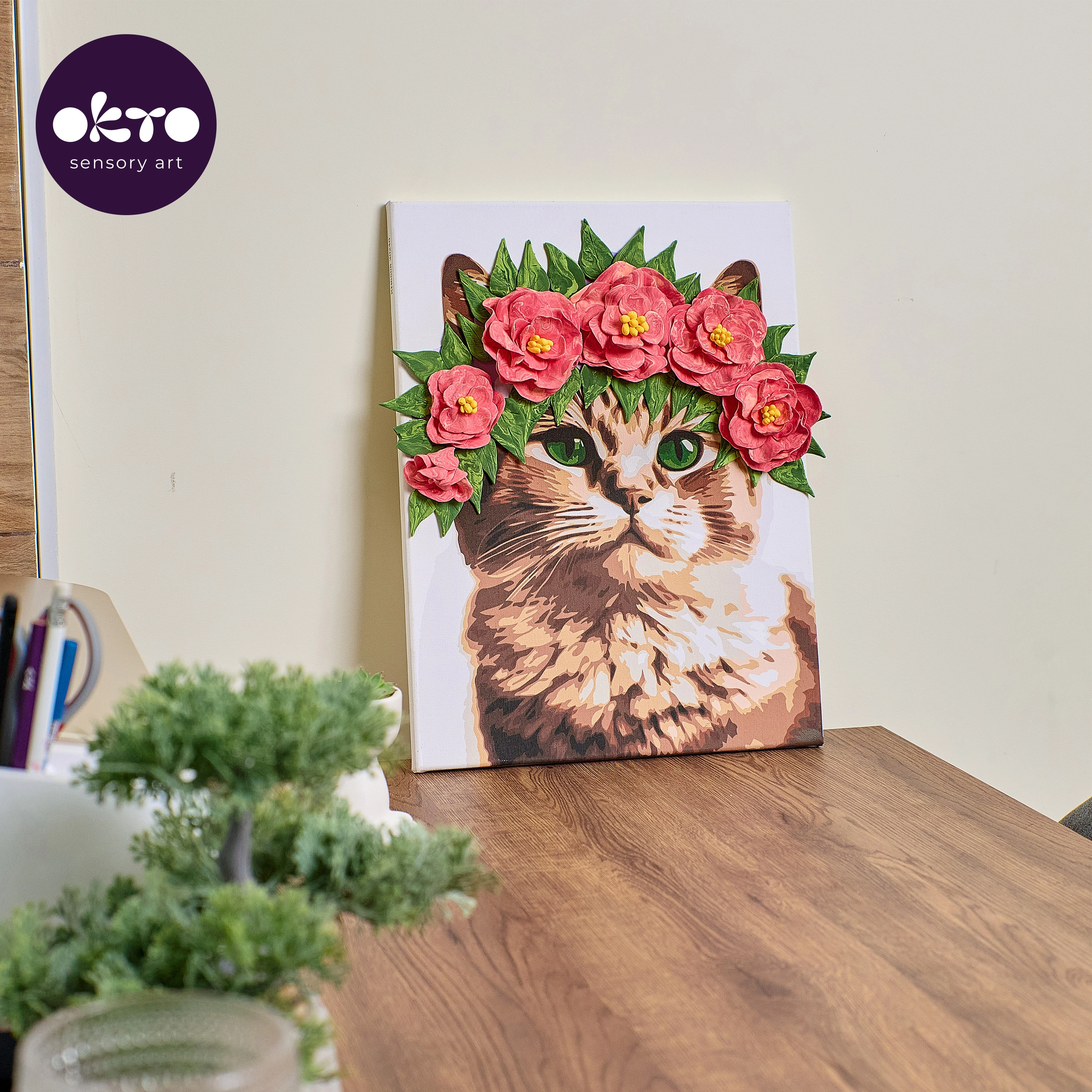 Objavte radosť z kombinácie maľby a modelovania s originálnym obrazom OKTO. Vďaka samoschnúcej hmote vytvoríte plastické detaily kvetinovej koruny a maľbou im dodáte farby aj hĺbku. Výsledkom je jedinečná dekorácia, ktorá zaujme v každom interiéri.