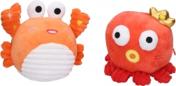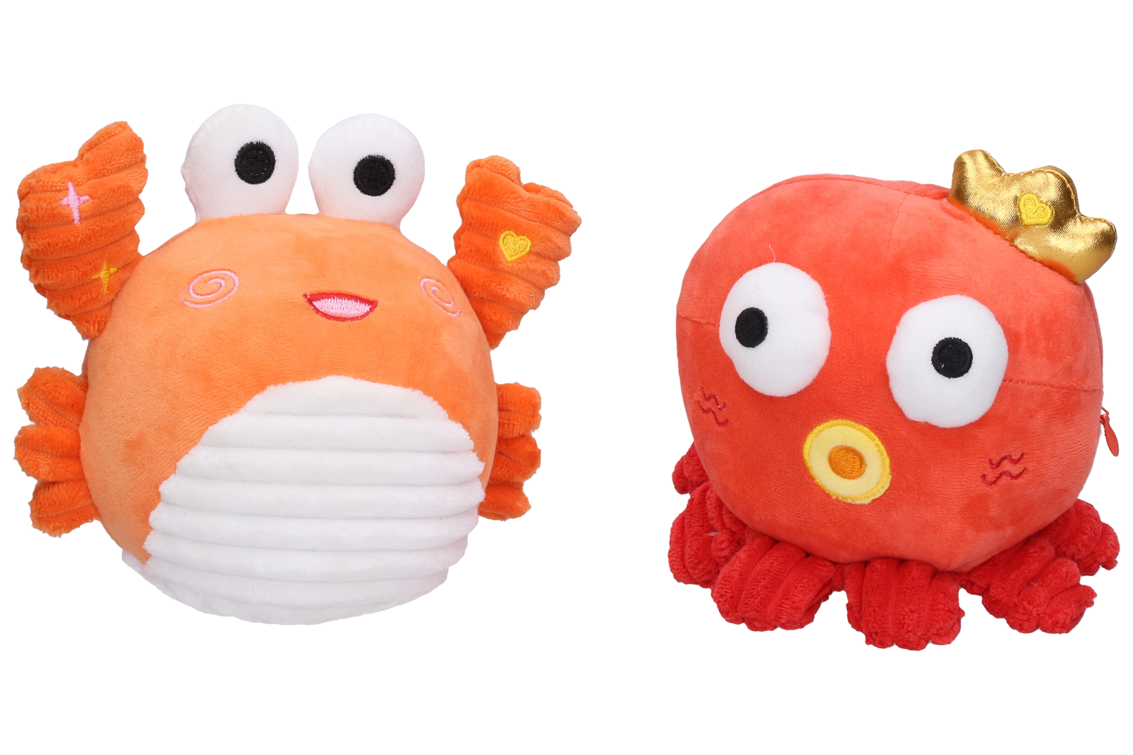 Na výber sú 4 roztomilé varianty – krab, kuriatko, modrá chobotnica a červená chobotnica. Každé zvieratko má svoj ovládací prvok (klepietko, krídlo, čiapku/korunku), takže deti rýchlo pochopia, ako hračku používať. Vypnutie je riešené praktickým on/off prepínačom vo vnútri hračky a zadný zips umožňuje jednoduchý prístup k batériám.