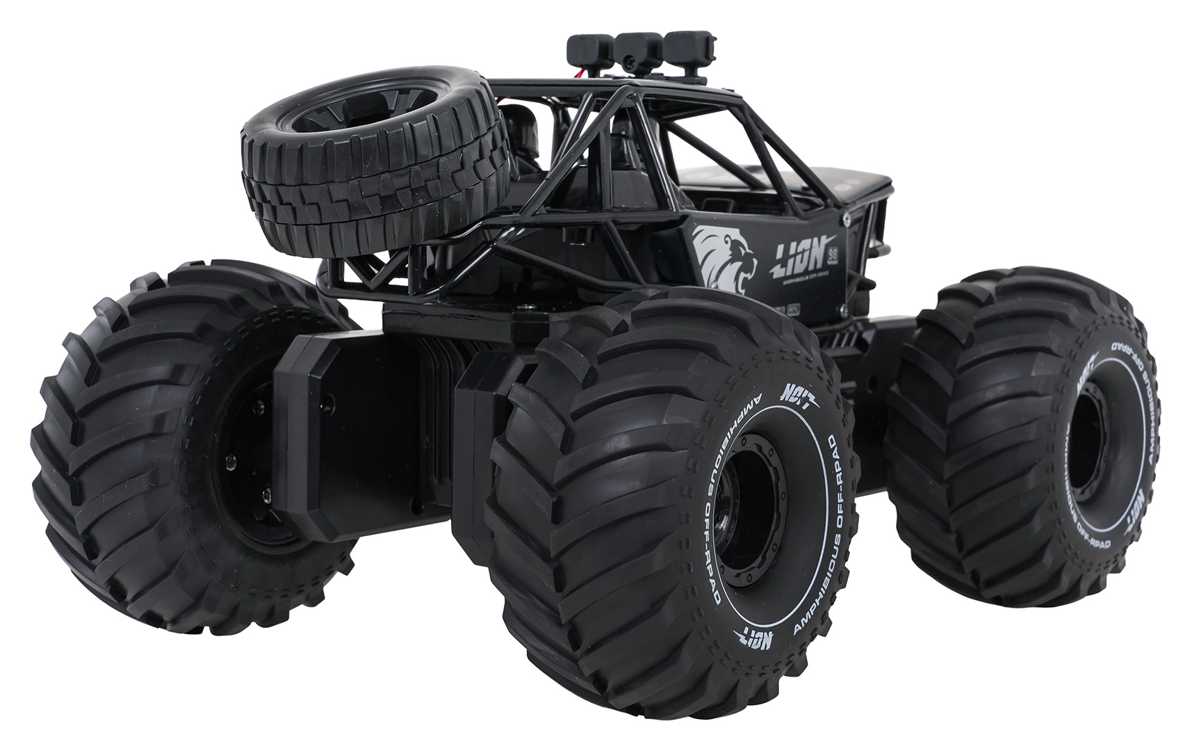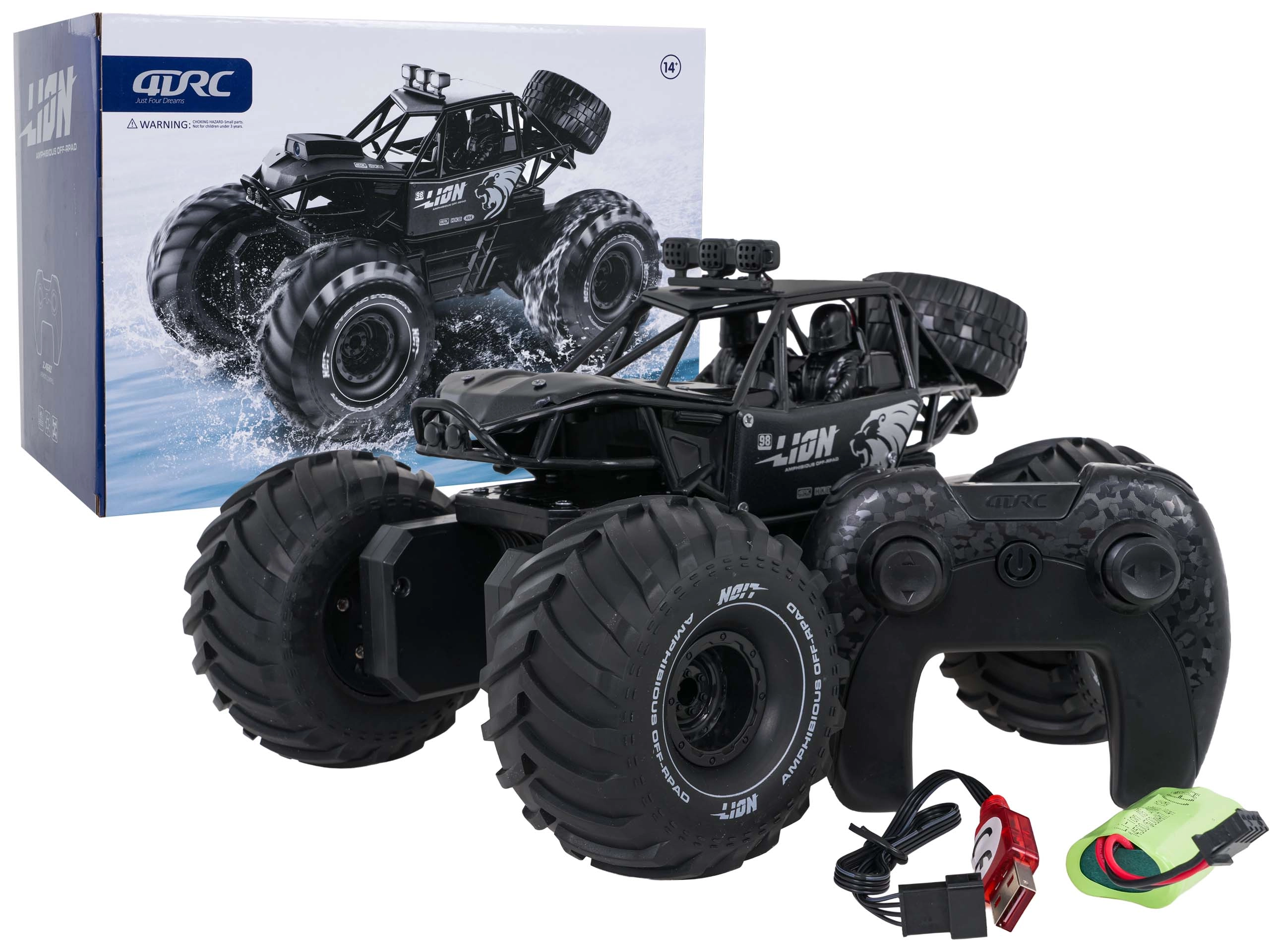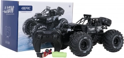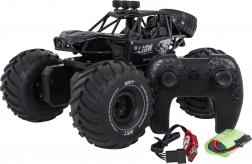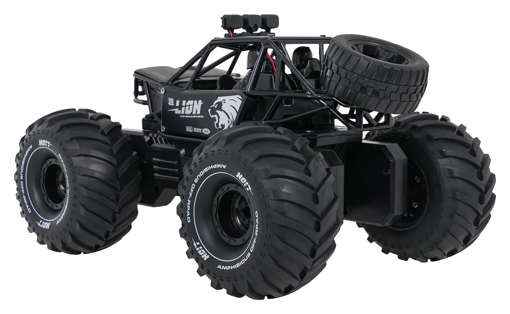 RC terénne auto LION v čiernej farbe kombinuje robustnú kovovú karosériu s pohonom 4x4 pre istotu v teréne. Veľké, protišmykové kolesá s výrazným behúňom zvládajú štrk, trávu aj nerovnosti, zatiaľ čo antikoliszná konštrukcia chráni voz pri nárazoch. Ovládanie na frekvencii 2,4 GHz zabezpečuje stabilný dosah bez rušenia.
