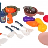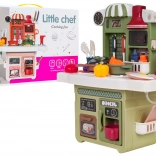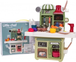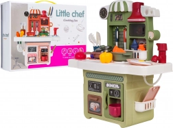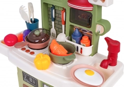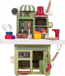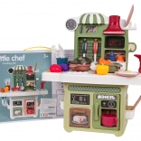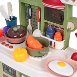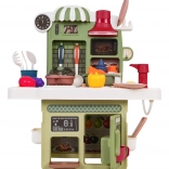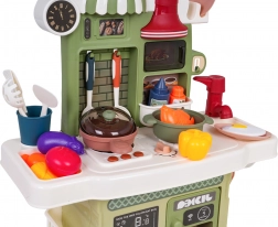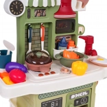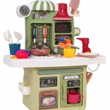 Súčasťou je funkčný kohútik s obehovou vodou (na pumpičku), takže si deti môžu „umývať“ riad rovnako ako v skutočnej kuchyni. Nechýba ani maketa kávovaru, osvetlený odsávač pár a otváracia rúra. Veľké množstvo doplnkov – hrnce, panvice, tanieriky, náradie a potraviny – rozširuje možnosti hry.