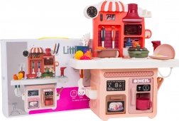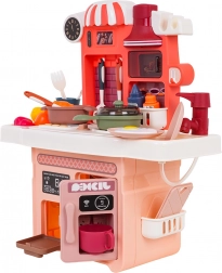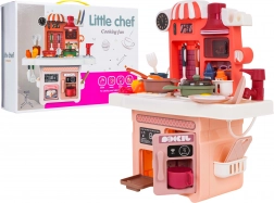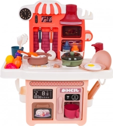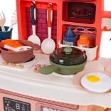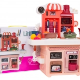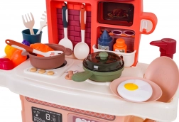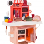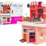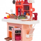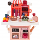 Skutočnou atrakciou je funkčný kohútik – z batériového čerpadla tečie voda do drezu, takže si deti môžu „umývať riad“ ako v skutočnej kuchyni. Súčasťou je tiež otvárateľná rúra, imitácia kávovaru a osvetlený odsávač pár. Bohaté príslušenstvo (hrnce, panvička, náradie, tanieriky a potraviny) rozširuje možnosti hry.