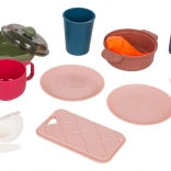 Panvička, hrniec s pokrievkou, tanieriky, šálky, kuchynské náradie a rôzne potraviny (ryba, zelenina, vajíčko) rozvíjajú kreativitu aj sociálne zručnosti.